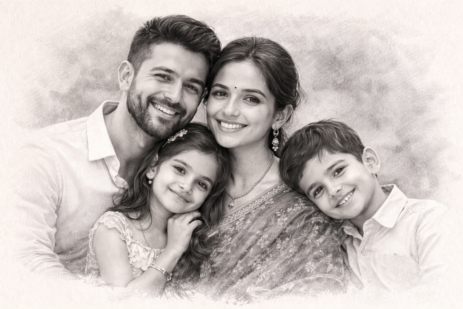 This is a digital artwork, not AI-generated and not a filter. Your family photo is transformed into a realistic black-and-white pencil sketch that you can cherish forever.